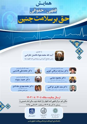 به گزارش دبیرخانه همایش در معاونت پژوهش مجتمع آموزشی و پژوهشی ائمه اطهار(ع)، همایش فقهی و حقوقی «حق بر سلامت جنین» با همکاری مرکز تحقیقات اخلاق و حقوق پزشکی با موضوع بررسی ابعاد و مسائل مختلف فقهی و حقوقی سلامت جنین در شهر مقدس قم برگزار میگردد.