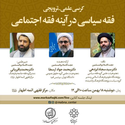 کرسي علمی ترویجی «فقه سیاسی در آینه فقه اجتماعی» در مرکز فقهی ائمه اطهار علیهم السلام برگزار میگردد.